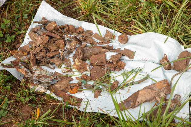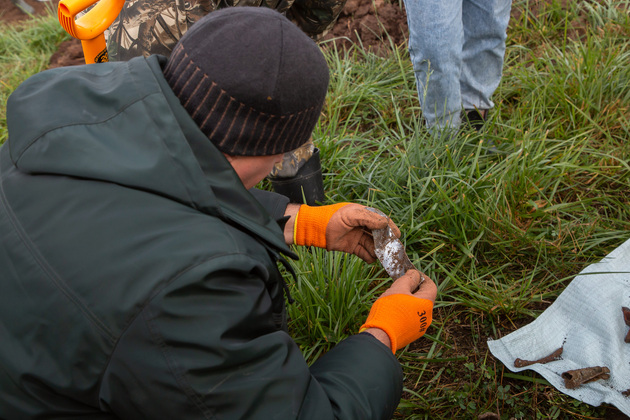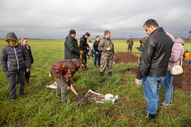 Поисковики ранее находили на этом поле фрагменты боеприпасов, так как самолет был полностью снаряжен боекомплектом. Еще волонтерам попадались элементы обшивки и мотора, лопастей, обвеса. Фрагменты находили на глубине ниже работы тракторного плуга.