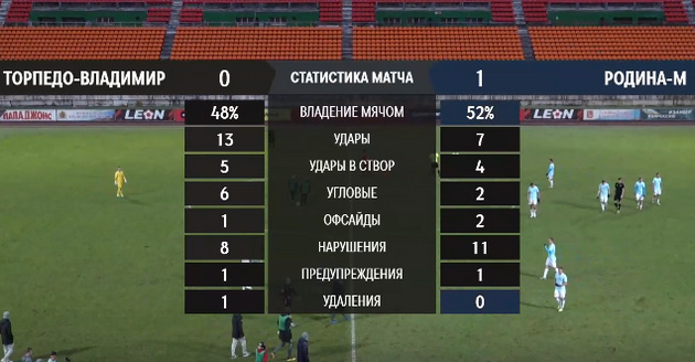 Плюс еще фактор везения оказался на стороне «Родины-М». У «Торпедо» и в первом тайме были голевые моменты, а у «Родины» лишь отдельные удары по воротам и ни одного в створ. И все-таки единственный гол в этом матче оказался в пользу гостей. Хотя мяч забил – не желая этого, конечно, - игрок «Торпедо» Данил Глинский. Он случайно срезал мяч в собственные ворота. Автогол. Это было уже на 52-й минуте.