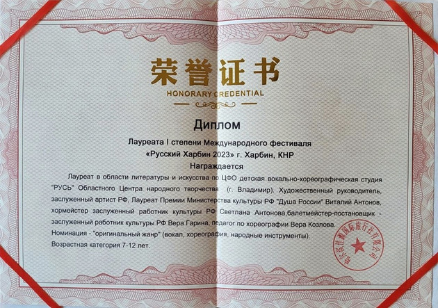 Детская вокально-хореографическая студия «Русь» стала лауреатом I степени на ХII Международном фестивале культуры и искусства в Харбине, сообщает Областной центр народного творчества. Юные артисты были в Китайской Народной Республике с 25 по 31 октября.