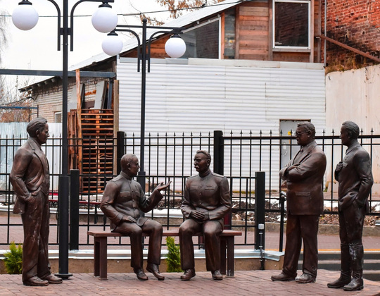 Василий Дегтярев изображен в движении: великий конструктор объясняет что-то своим коллегам, а те его очень внимательно слушают.