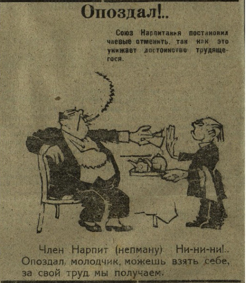 «Союз Нарпитания постановил чаевые отменить, так как это унижает достоинство трудящегося». Сообщение сопровождалось карикатурой, на которой член Нарпит, официант, говорит нэпману, протягиваюшему ему чаевые: «Ни-ни-ни! Опоздал, молодчик, можешь взять себе, за свой труд мы получаем».