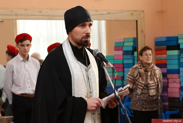 Духовным напутствием будущим бойцам стала общая молитва - благословение на ратный подвиг, составленное более пяти столетий назад. По традиции, священник Свято-Казанского храма города Владимира отец Алексей (Горев) благословил воинов и окропил всех собравшихся святой водой.