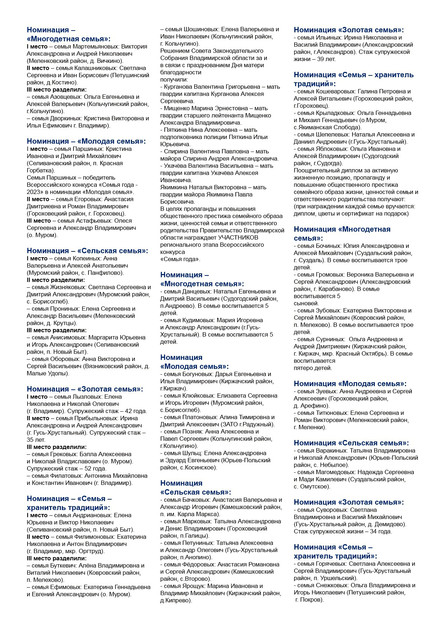 В этом году в конкурсе участвовало 56 семей из 20 муниципалитетов области, 21 семья вошла в число победителей регионального этапа. А семья Паршиных из Красной Горбатки стала победителем Всероссийского конкурса «Семья года» в номинации «Молодая семья». 7 семей – участников регионального этапа получили специальные призы от общественного благотворительного фонда содействия защите материнства и детства «МАМА» и Владимирского областного союза женщин.
