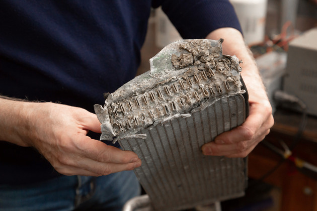 А еще Михаил показал, как выглядит бывший в эксплуатации загрязненный радиатор охлаждения двигателя. Для наглядности исследователи разрезали радиатор, чтобы оценить степень загрязнения. Видно невооруженным глазом: он буквально забит различными частицами. И вот с такими испытаниями сталкивается автомобильная техника! Конечно, ничего вечного не бывает, но за счет инженерных решений срок эксплуатации автомобиля можно продлить.