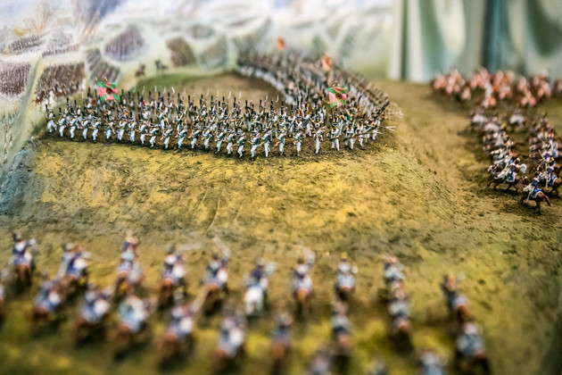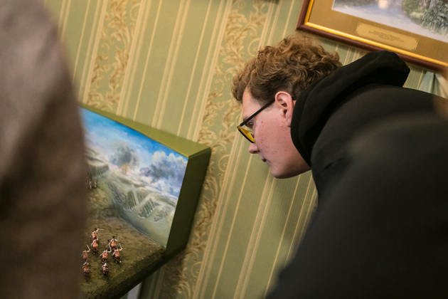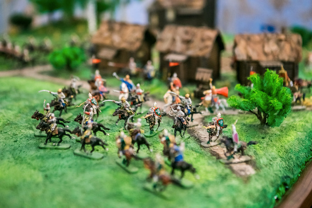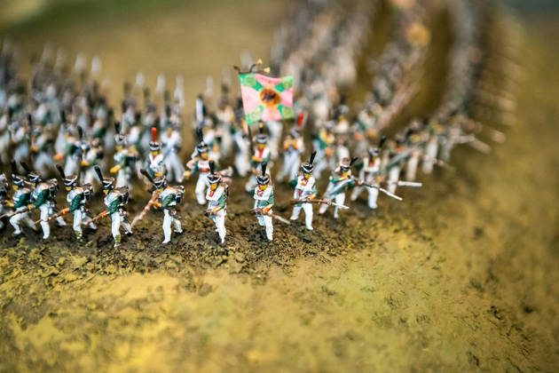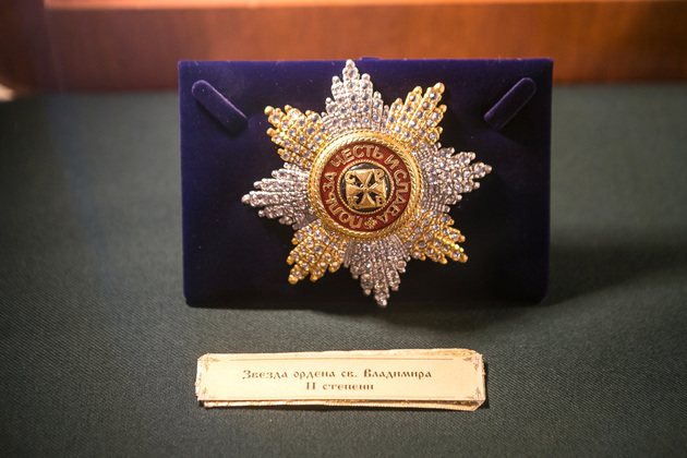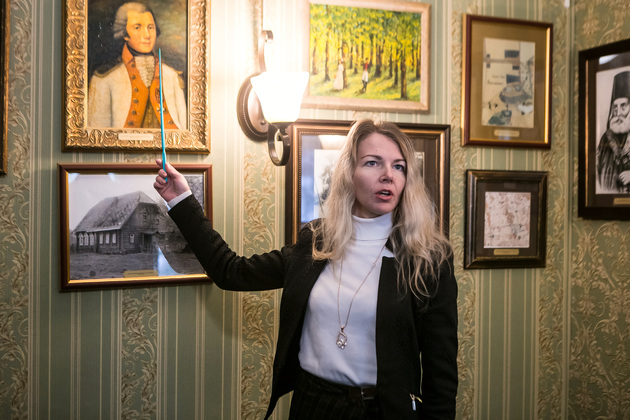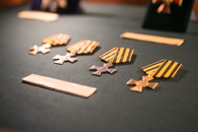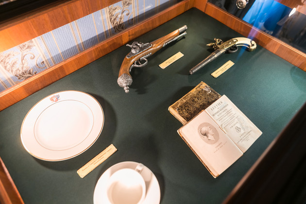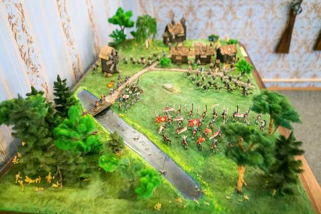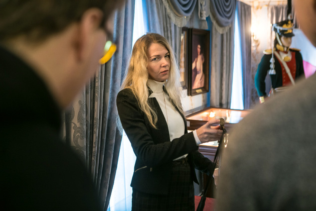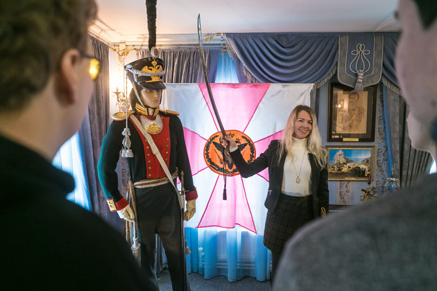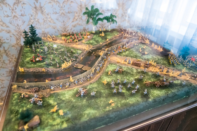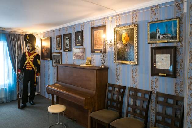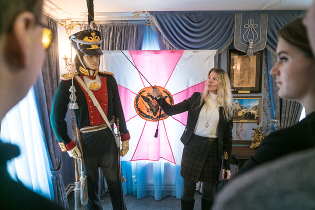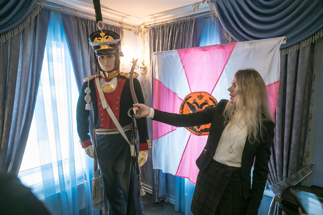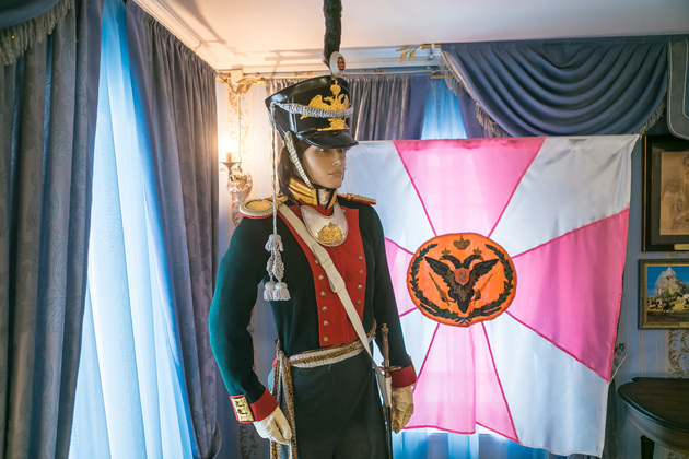 Людмила обращает наше внимание на манекен поручика лейб-гвардии Литовского полка. Это копия настоящего мундира, изготовленного профессиональным мастером Сергеем Прокоповичем из подмосковного Красногорска. Его работы находятся во многих российских и зарубежных музеях.