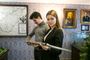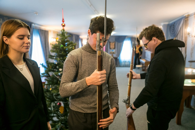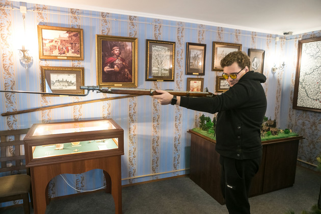 На стенах висят макеты ружья и карабина 1812 года со штыками. На вид как настоящие. Экскурсовод Людмила Ветрова разрешает студентам подержать оружие в руках: «Суворов сказал: «Пуля дура, а штык молодец» - это как раз об этом оружии.