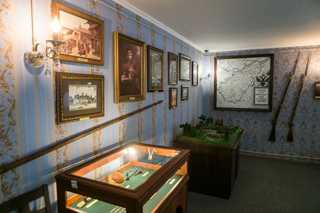 В интерьерах музея воссоздан дух давно минувшей эпохи. Здесь собраны родовые гербы владельцев села Павловского XVI-XIX столетий. Тут же и уникальные экспонаты - походный офицерский столик поры наполеоновских войн, бюро из красного дерева, старинные фолианты, реплики орденов, подлинные французские гравюры, портреты военачальников, мини-диорама «Каре лейб-гвардии Литовского полка на Бородинском поле». Антикварные вещи - дар столичного мецената и других спонсоров, при этом часть экспонатов приобретены на средства музея.