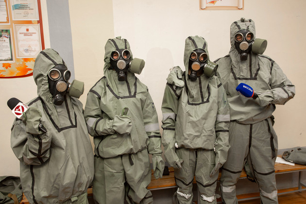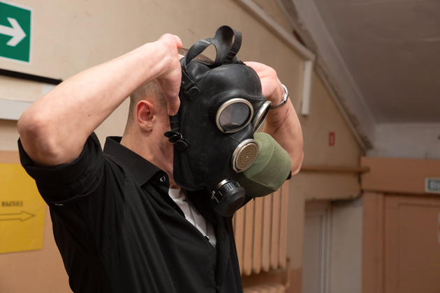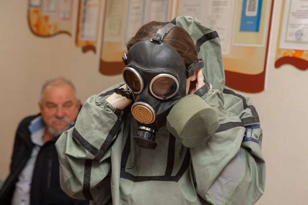«Произошла утечка хлора. У вас могут быть ожоги дыхательных путей, а также ожоги кожи и глаз. Этот аппарат [противогаз] сможет вас защитить от ожогов. Нужно будет промыть слизистые пути и кожу двухпроцентных раствором соды, это защитит от воздействия хлора. Также нужно выйти на свежий воздух».