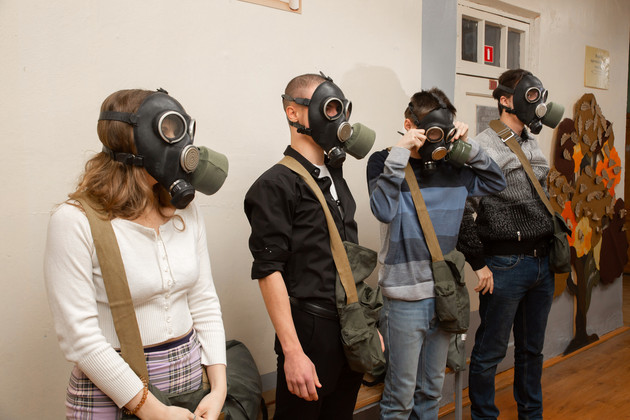 Журналисты не только посмотрели полностью поток по всем элементам – от начала до выхода, но и отработали надевание противогазов и защитного костюма Л1 (населению такой не выдается). Все силовые структуры обеспечены данными видами защитных комплектов. На пункте выдачи (отдельно для детей и взрослых) спрашивают данные местожительства человека и выдают талон на получение СИЗ. Там же снимают мерки головы и озвучивают размер противогаза. Затем происходит подготовка СИЗ, то есть, изделие дезинфицируют.