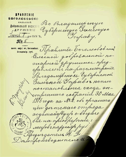 Ознакомление детей осторожному обращению с огнем, предупреждение пожаров от детской шалости, других бедствий и несчастных случаев, «подготовка детей к добровольному пожарному служению, а также развитие духа дисциплины, ловкости, смелости и любви к ближнему, обучение детей военному строю и гимнастике» – все вышеперечисленное и легло в основу прошения гладышевских добровольцев. В августе того же года канцелярией губернатора в адрес Судогодского уездного исправника предписано следующее: получить письменное согласие от родителей будущих юных добровольцев, а для учащихся – разрешение и учебного начальства. «О чем было испрошено согласие родителей, и на сей предмет у Правления имеется собственная записка 1915 года, января 31 дня», – читаем в прошении старосты дружины Егора Гаврилова.