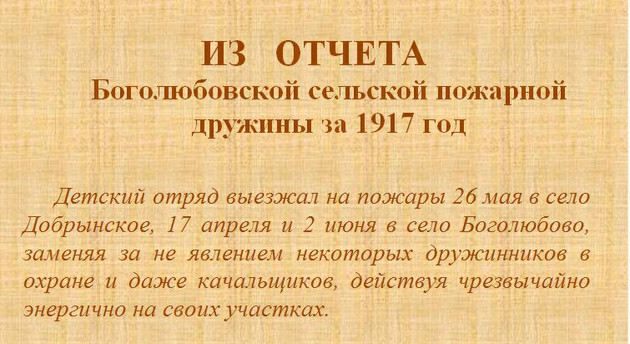 Задачи были поставлены нешуточные – обучить мальчишек правилам осторожного обращения с огнем, приемам тушения огня, спасания и самоспасания, оказания первой медицинской помощи. С радостью и рвением юные жители поселка Боголюбово учились выполнять команды, тренировались в развитии ловкости, быстроты, умения преодолевать препятствия – качествах, особенно необходимых огнеборцам. «Работа с детьми шла, но не так споро», – отмечалось в отчете дружины. Но, как говорится, дорогу осилит идущий. Безусловно, дети гордились своим новым «статусом», если учесть, что из числа многочисленных сверстников предпочтение отдали им (население села Боголюбово в 1916 году составляло не менее 1800 человек). Старания учителей вскоре дали результаты, и судя по деятельности Боголюбовского детского отряда, это был не отряд «потешных». Это была прекрасно обученная, организованная деревенская молодежь, всегда готовая прийти на помощь сельской пожарной дружине. Вот что записано в отчете дружины за 1917 год: «Детский отряд выезжал на пожары 26 мая в село Добрынское, 17 апреля и 2 июня в Боголюбово, заменяя за не явлением некоторых дружинников в охране и даже качальщиков, действуя чрезвычайно энергично на своих участках».