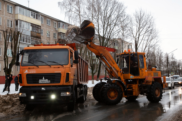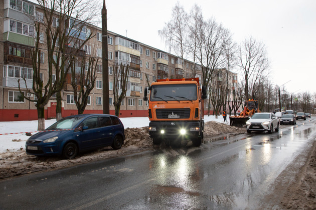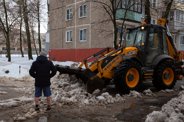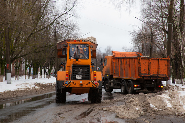 Одной из точек борьбы с последствиями обильных декабрьских снегопадов в это утро среды стала улица Егорова. Здесь фронтальный погрузчик сгребал снег с кромки проезжей части и наполнял им кузов грузовика. Еще один погрузчик на базе трактора «Беларусь» неподалеку очищал территорию у магазинов на углу. А по тротуару рядом отправился в путь трактор с прицепным оборудованием для разбрасывания песко-соляной смеси.