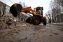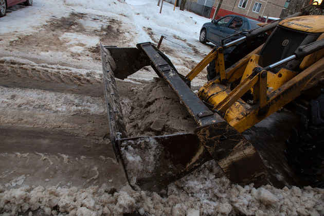 Один из таких погрузчиков чистил проезд по двору. Здесь еще удобно это делать, потому что жители ставят свои авто на парковку, которую сами создали во дворе.