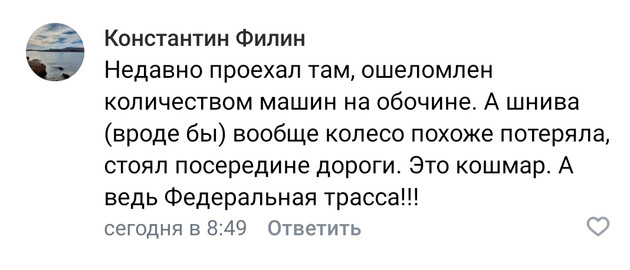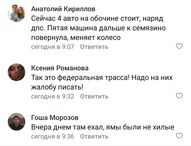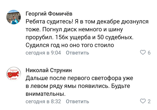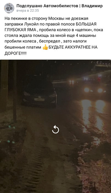 «На пекинке в сторону Москвы не доезжая заправки Лукойл по правой полосе БОЛЬШАЯ ГЛУБОКАЯ ЯМА, пробила колесо в «щепки», пока стояла ждала помощь за мной еще 4 машины пробили колеса , беспредел , зато налоги бешенные платим БУДЬТЕ АККУРАТНЕЕ НА ДОРОГЕ!!!!!!!!» - говорится в сообщении от 20 декабря.