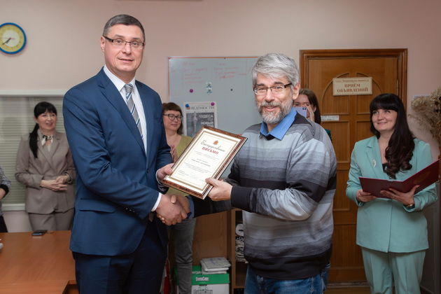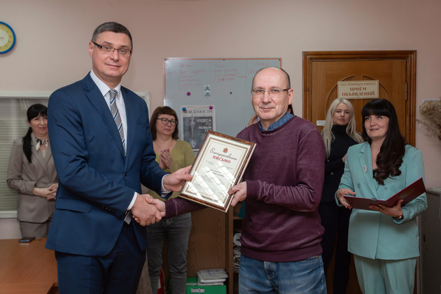 Александр Авдеев дружески пообщался с сотрудниками редакции, и по случаю профессионального праздника вручил благодарственные письма редактору печатного еженедельника «Владимирских ведомостей» Сергею Мальянову и автору этих строк.