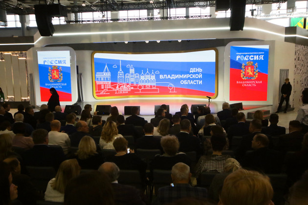 Презентация региона. В культурном центре (по сути, большой зрительный зал со сценой в том же 75-м павильоне ВДНХ) проходила презентация Владимирской области. По пути туда замечаю, что наш регион упомянут и на стенде Донецкой области, где на экране крупно начертано: «Спасибо региону-шефу Владимирской области от Докучаевска».