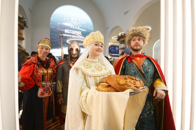Народ идет на выставку «Россия» в огромном количестве, особенно в этот воскресный день. И вот - официальное открытие дня Владимирской области. Появились главные исторические персонажи церемонии - Петр и Феврония Муромские, Илья Муромец и другие.