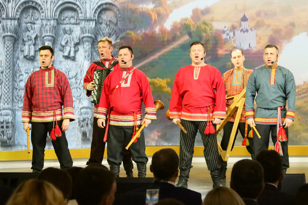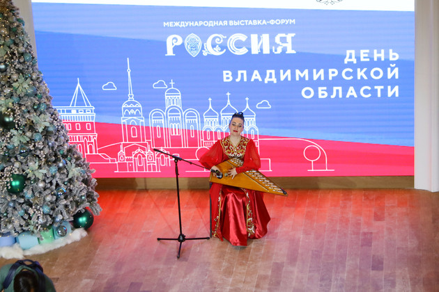 Музыкальное сопровождение презентации региона на выставке обеспечили «Владимирские рожечники», а потом солист Сергей Горшков и ансамбль «Русь» исполнили новую песню «Владимирский край» (музыка Александра Морозова, слова Виктора Малыгина).