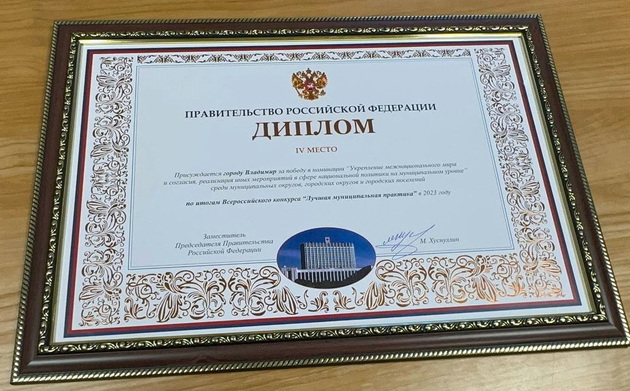 Представителям делегации города Владимира вручили награду за победу во Всероссийском конкурсе «Лучшая муниципальная практика». По итогам конкурса Владимир занял 4-е место в номинации «Укрепление межнационального мира».