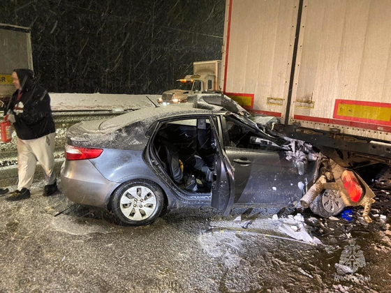 В результате аварии произошло серьёзное столкновение 2-х транспортных средств. Судя по фото, представленным пресс-службой ведомства, легковой автомобиль столкнулся с фурой. Удар был такой силы, что кузов легковушки «заехал» под фургон.