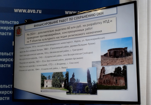 И вот, как договорились губернатор Александр Авдеев и митрополит Владимирский и Суздальский Тихон, губернатор инициировал новый областной проект - пока не по реставрации, но хотя бы по консервации и проведению противоаварийных работ на особо пострадавших церквях, находящихся в неудовлетворительном состоянии. И теперь хотя бы дополнительно на несколько храмов в год теперь начали находить областные деньги, чтобы не допустить дальнейшего разрушения.
