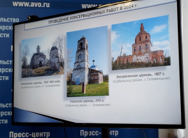 Александр Авдеев выделил уже в 2023 году 12 млн рублей на то, чтобы провести необходимые работы на двух памятниках - Введенской церкви в селе Мостцы Камешковского района и Никольской церкви в селе Семёновское-Советское Суздальского района.