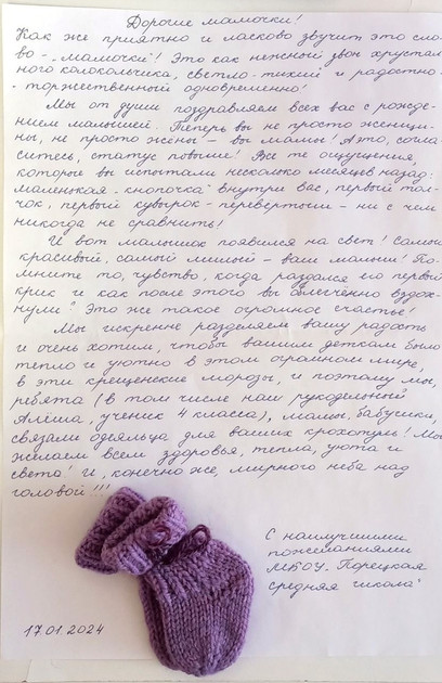 Доброе дело с удовольствием поддержали мамы и бабушки школьников, педагоги и даже мальчик Алеша, который учится в четвертом классе и тоже умеет вязать. Подарки ребята сопроводили трогательным письмом. В нем они от души поздравили всех рожениц с долгожданным событием и пожелали им и малышам здоровья, тепла и уюта.