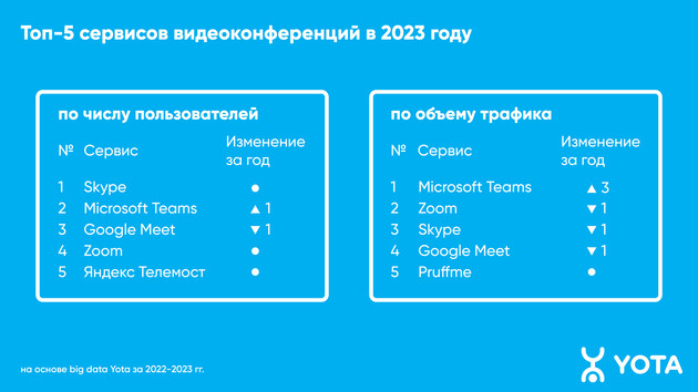 По итогам 2023 года Zoom потерял лидерство среди сервисов для видеоконференций: расход трафика внутри приложения снизился на 38% в сравнении с 2022 годом. Аналогичный спад демонстрирует Skype, где активность абонентов уменьшилась на 34%, а также Google Meet — падение на 30%. На первую строчку вырвался Microsoft Teams, он единственный среди иностранных сервисов этого сегмента показал значительный рост потребляемого трафика — в три раза.