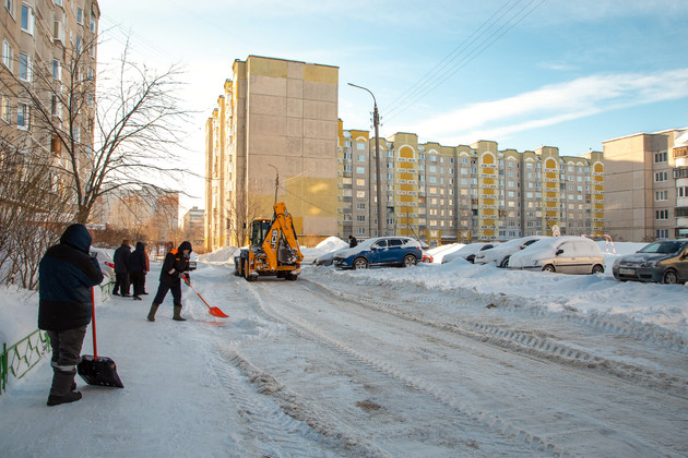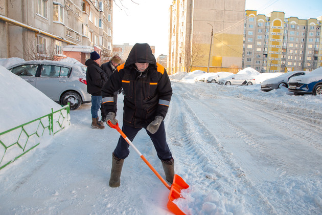 Утром в пятницу после обильного снегопада, принесенного циклоном «Ольга», Анатолий Медведев и его напарник с лопатами в руках расчищали двор у дома 3б на улице Комиссарова во Владимире в составе целой команды. А это еще два тракториста на фронтальных тракторах-погрузчиках разного размера.