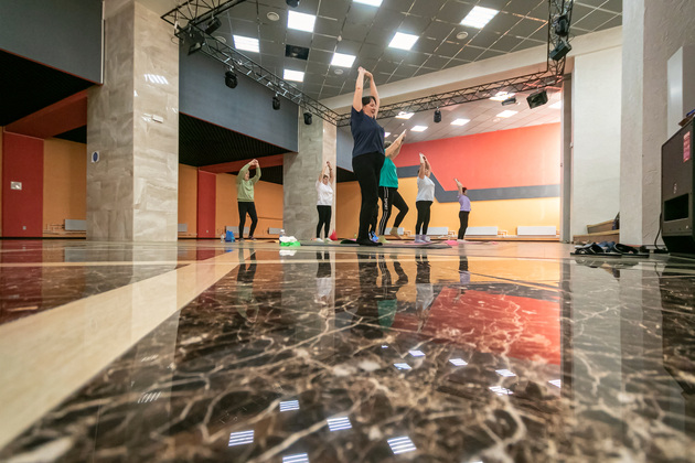 В малом зале идет занятие группы здоровья. Играет танцевальная музыка. Женщины занимаются фитнесом под руководством тренера. До ремонта представить себе фитнес зимой было невозможно. Теперь малый зал будто создан для этого. Утром на занятия приходят люди старшего возраста, а вечером - приверженцы ЗОЖ помоложе.