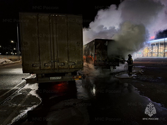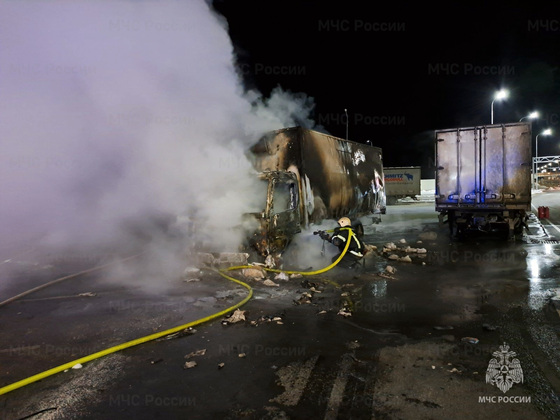 Здесь загорелся грузовик. Пожарные заливали фургон и кабину. По предварительной оценке, огонь затронул 23 кв. метра - машина выгорела основательно.