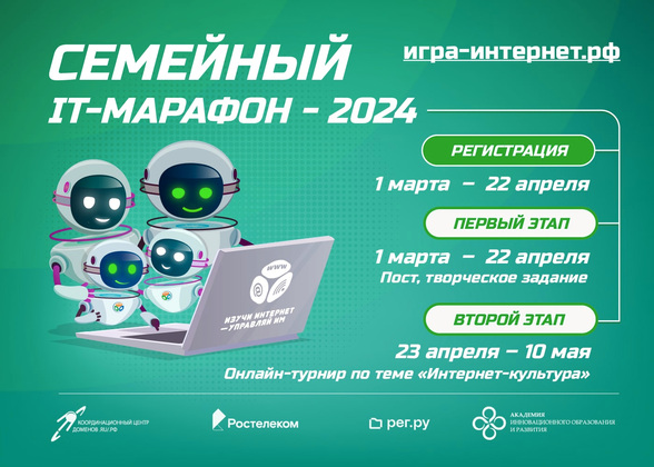 IT-марафон проходит на портале интерактивного образовательного проекта «Изучи интернет — управляй им» до 15 мая 2024 года. Регистрация семейных команд открыта до 22 апреля. Результаты будут объявлены в Международный день семьи, который ежегодно отмечается 15 мая.