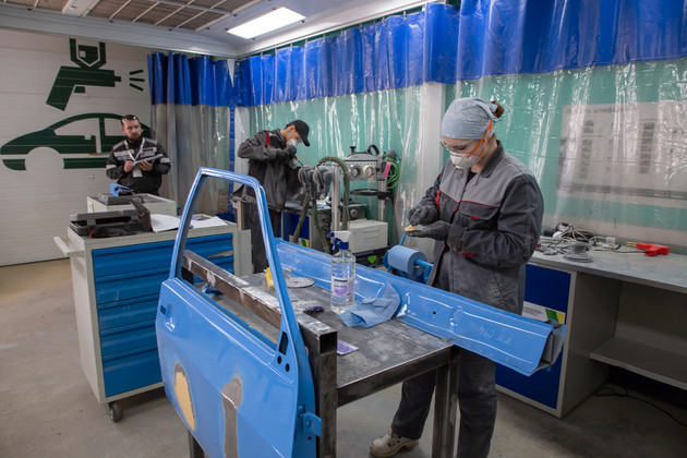 Двое ребят в респираторах как раз трудились на завершающем этапе подготовки отремонтированных элементов кузова к покраске. Это, можно сказать, финишная прямая.