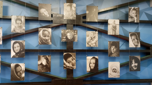 На этой выставке только портреты. И только женские. Все работы черно-белые, что автор объясняет особенностями небольшой экспозиции. Еще одна общая черта - на подавляющем большинстве фотографий лица обрамлены платком. А платок, конечно, заметно усиливает притяжение женских глаз. Именно взгляд становится главным в каждом женском образе.