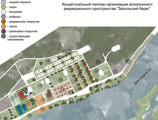 По проекту берег водоёма превратится в современную обустроенную зону отдыха с песчаным и газонным пляжами, фудкортом, кинотеатром под открытым небом, поляной для проведения мероприятий, спортивными площадками для игры в футбол, волейбол, теннис, бадминтон и большой детской площадкой. Для туристов построят глэмпинг, кэмпинг и обустроят домики на воде.