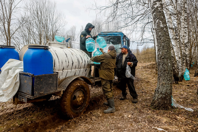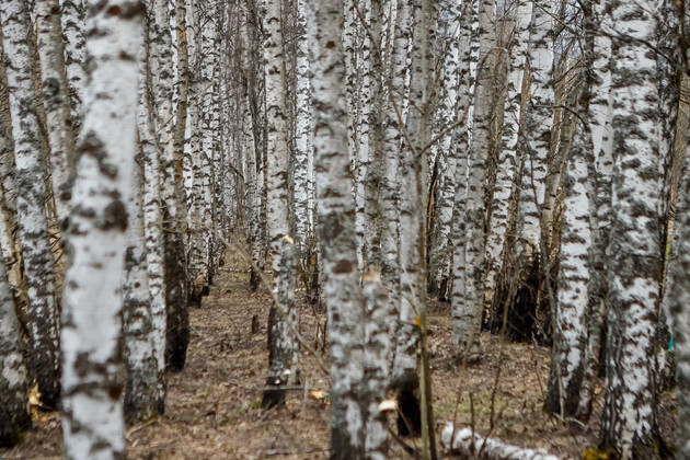Трактор трогается, и мы плавно выезжаем на полевую дорогу. Участок заготовки примерно в трех километрах от поселка. Надо сказать, наш путь был непростым. В низинах земля не просохла после разлива талых вод. В полях настоящая распутица. Временами прицеп заносило и раскачивало так, что приходилось крепко держаться. Но вот на пригорке показываются ряды берез с пластиковыми кегами цвета аквамарин. Наконец-то приехали.