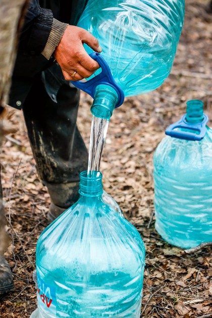 Мы убедились, что заготовка сока - тяжелая физическая работа, требующая выносливости и сноровки. На вытянутом, словно шеренга, участке 140 двадцатилитровых бутылей: где-то они заполнены наполовину, а где-то на треть. Это столько накапало с полвосьмого утра, а мы приехали на участок в 13:00. Для удобства содержимое некоторых кегов необходимо перелить в другие бутыли и не промахнуться.