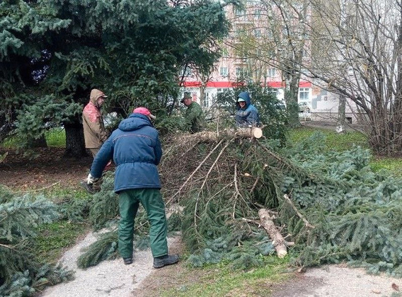 В мэрии рассказали, что ветром были повалены деревья на улицах Красноармейской, Диктора Левитана, Мира, в том числе упала голубая ель в районе дома № 42 по Октябрьскому проспекту.