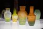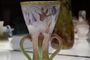 Под номером два – ваза с небольшой надписью. С 1880 года Галле создавал так называемые «говорящие» предметы, то есть писал на изделиях изречения известных поэтов той эпохи. Строка переводится как «Перо на ветру», потому что здесь изображены одуванчики – один из символов Франции. Интересно выглядят и маленькие вазочки для одного цветка, которые называются солифлер. На изделиях изображены растительный орнамент и виноградные гроздья.