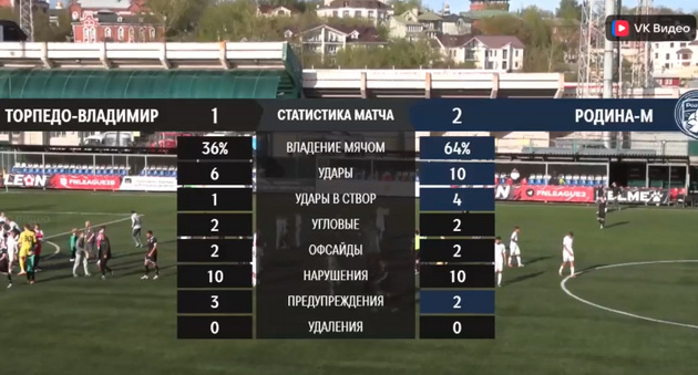 В многих моментах москвичи смотрелись более напористыми и раскрепощенными, чем владимирцы. Это подтверждает и статистика матча. В количестве ударов по воротам и по времени владения мячом «Родина-М» значительно превзошла торпедовцев.