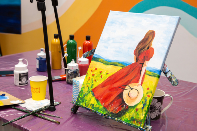 Обычно команда проекта подбирает тематику мастер-классов по сезону. К примеру, летом более популярны картины с морем, девушками на пляже, какие-то песчаные истории, а зимой ориентируются на минимализм и нежные оттенки палитры. В этот раз мы вместе с несколькими участницами мастер-класса рисовали девушку в красном платье, которая смотрит на поле с маками, а на фоне – горы. Картина называется «Прогулка», ее автор неизвестен. Эта работа привлекательна именно тем, что в ней не используется пестрая цветовая гамма. Яркое пятно – красное платье более приглушенного оттенка. У картины очень простой сюжет, но необычный колорит (сочетание цветов в ИЗО) – немного глухой, но есть при этом ощущение воздушности и легкости, отметила Бугрова.