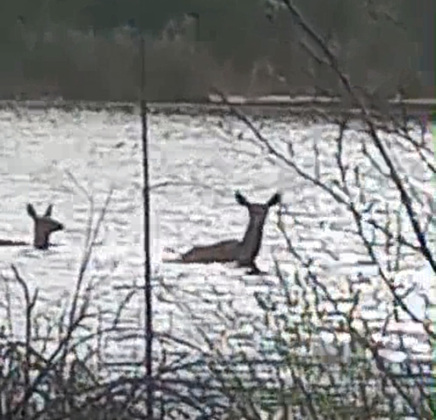 Преодоление водной преграды взрослой самкой и молодой особью благородного оленя удалось заснять в Петушинском районе.