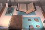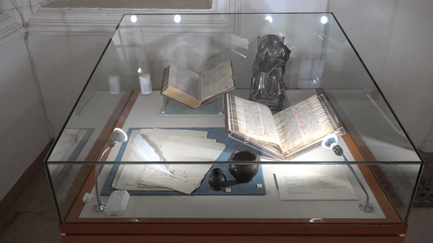 В другой витрине представлен Пролог, иллюстрирующий мастерство писцов «макарьевской школы». Тексты писали в размер листа, нередко в два столбца, декорируя заглавные буквы абзацев. Материалом служила бумага, доставляемая в стольный град из Западной Европы. Использовали железистые чернила коричневатого оттенка, а «ручками» служили гусиные перья. Готовую рукопись сшивали и «одевали» переплетчики. Обложку изготавливали из досок, обтянутых кожей с тиснением или дорогой тканью. Часто переплеты для декора и сохранности украшались металлическими «угольниками». Обязательны были застежки, чтобы книга не теряла свою форму.
