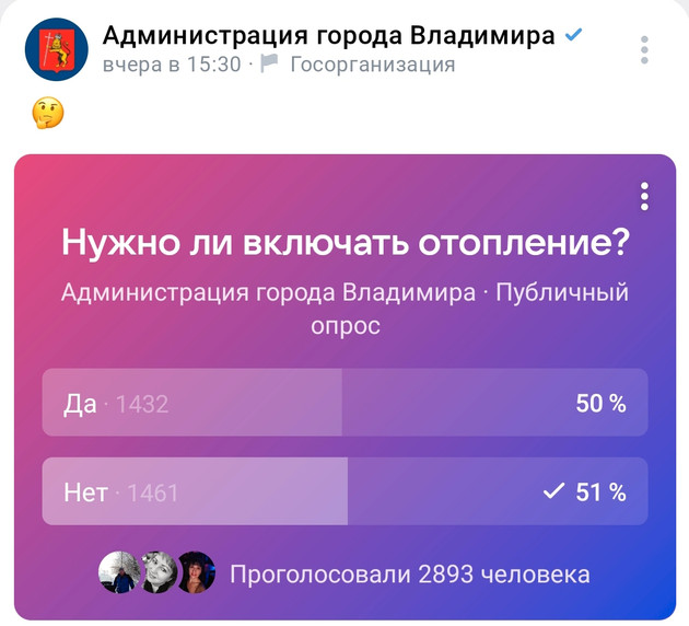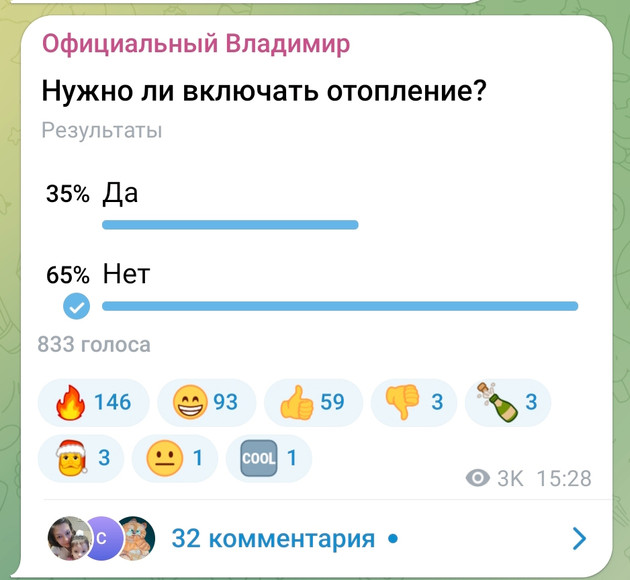 А вот в канале мэрии Владимира в мессенджере Telegram голоса распределились иначе. За возобновление отопительного сезона проголосовала лишь треть участников опроса, две трети - против.