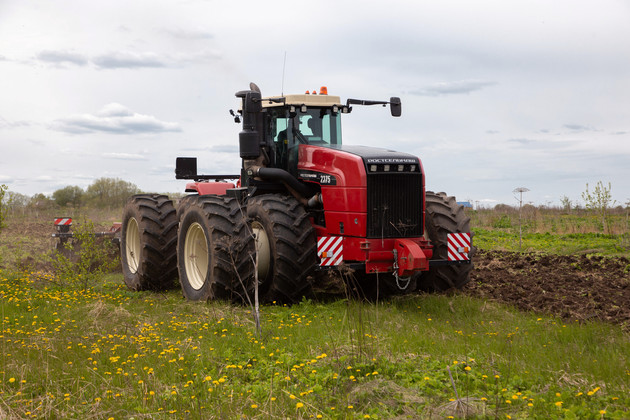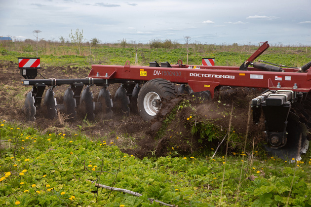 На таких открытых обширных угодьях сельхозназначения борщевик и прочая сорная растительность уничтожается прежде всего механическим способом. Хозяйство приобрело мощный трактор и тяжелую дисковую офсетную борону. Этот агрегат и был продемонстрирован в деле.