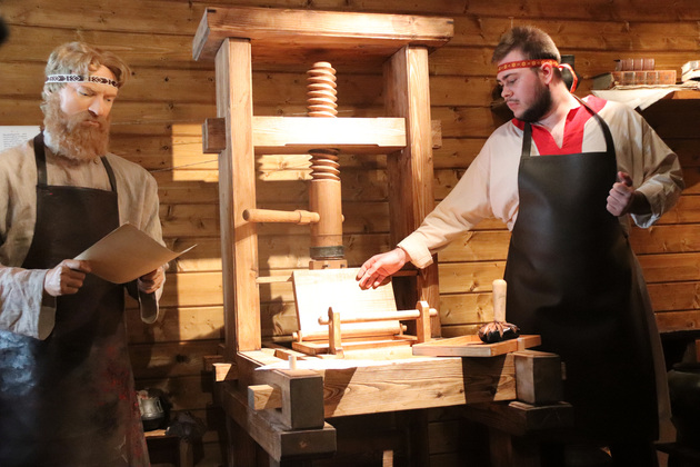 В течение всего дня для всех бесплатно проводилась театрализованная экскурсия, разработанная специально для этой экспозиции. Гости праздника не только увидели, как была устроена государева штанба, а еще встретились с «самим» мастером и узнали подробности об искусстве рождения средневековых книг.