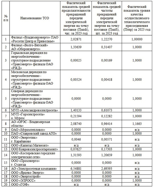 Фактические и плановые значения показателей уровня надежности и качества услуг по передаче электрической энергии, оказываемых территориальными сетевыми организациями Владимирской области, за 2023 год.