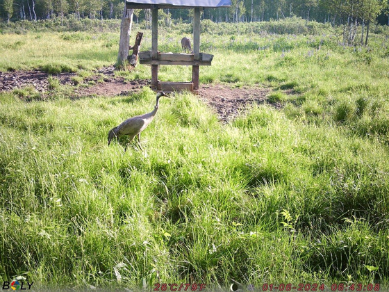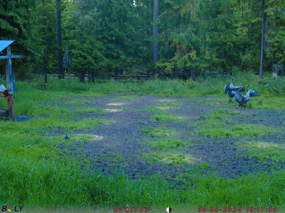 Возле оленьих кормушек журавлей сняли 30 мая в 19:17 - очевидно, во время ужина, а также 1 июня в 6:43 утра. На утренней фотографии видно, что за завтраком компанию журавлику составил и хозяин площадки.
