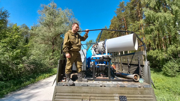 Как выглядит процесс обработки леса? По дороге со скоростью 20 км/ч едет автомобиль «Урал». На борту - гидродинамическая установка ГДУ-400 и бочка с раствором препарата. Из сопла, словно из гигантского баллона с аэрозолем, с гулом вырывается струя пара.