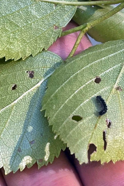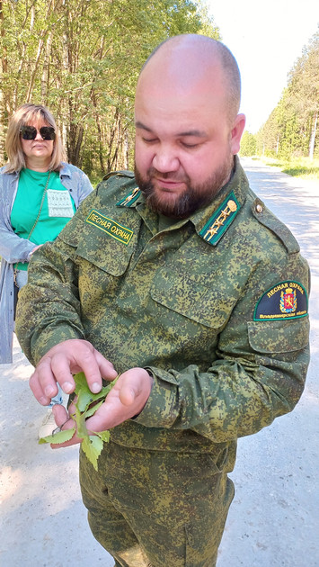 Директор лесничества срывает первую ветку березы и демонстрирует «следы» присутствия зловредного насекомого. На листочках видны невооруженным глазом маленькие гусеницы темного цвета длиной всего несколько миллиметров.